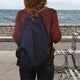 This triangle shaped leather backpack bag is made from a sturdy Italian cotton canvas in a navy blue color,combined with dark brown leather accents.