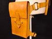 The large pouch is attached to the belt and leg strap with solid brass rings and held closed with the strap and loop arrangement pictured.
